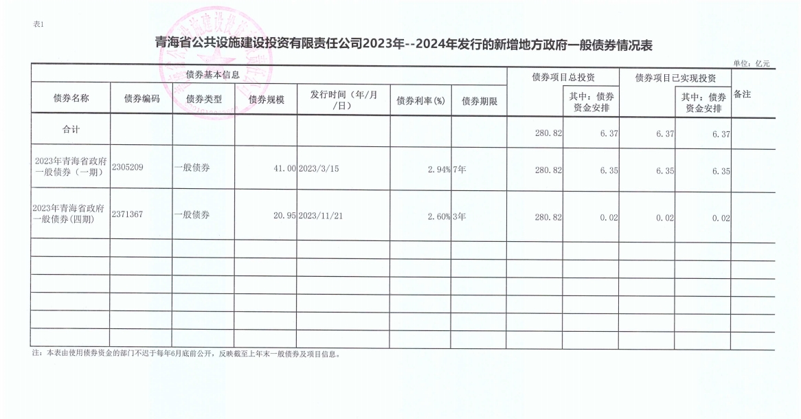青海省公共設施建設投資有限責任公司2023年--2024年發(fā)行的新增地方政府一般債券情況表